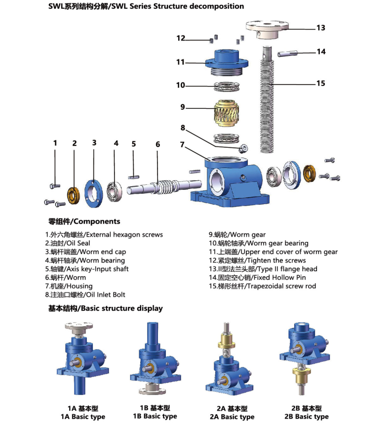 1、 JWM型(梯形丝杆型)适用于低速、低频率的场合, 主要构成部件为:精密梯形丝杆副与高精度蜗轮蜗杆副。
